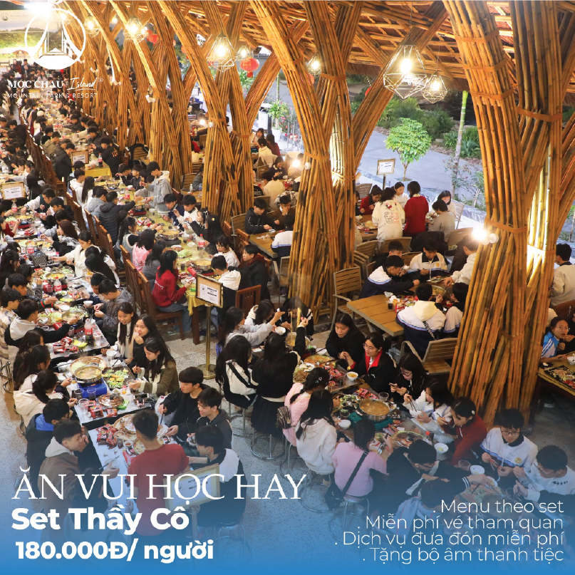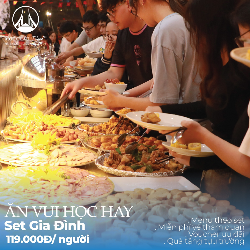 Không chỉ là nơi họp mặt cho những bữa tiệc tựu trường đầy ắp niềm vui, Mộc Châu Island còn mang đến cho bạn một hành trình trải nghiệm đa sắc màu – từ ẩm thực hấp dẫn, trò chơi giải trí sôi động cho tới những món quà ý nghĩa nhân dịp năm học mới. Mộc Châu Island giới thiệu 2 gói tiệc “Ăn Vui Học Hay” dành riêng cho tháng 9 tựu trường năm nay: