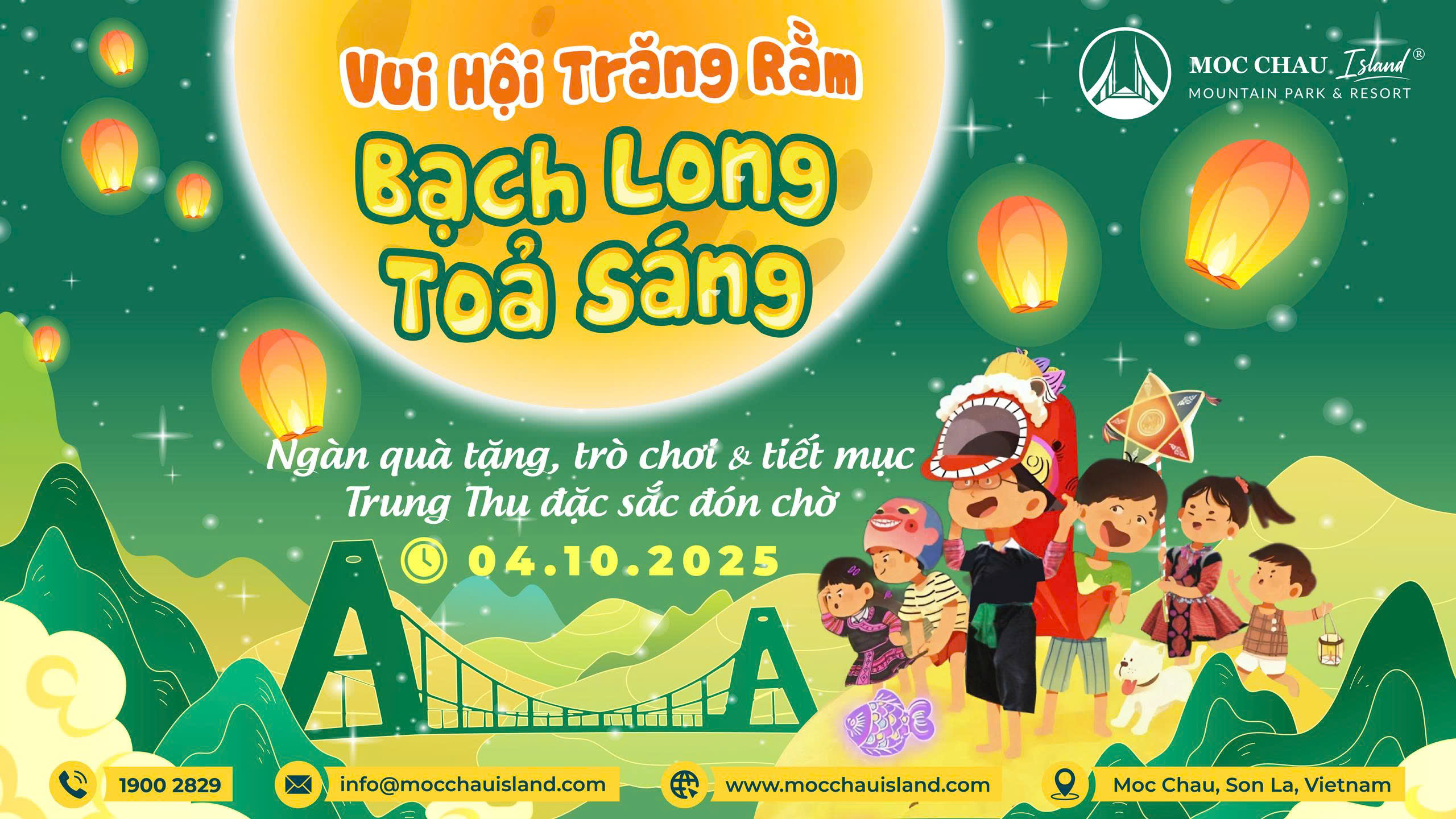 Trân trọng những giá trị truyền thống, mỗi mùa Trung Thu - Một trong những dịp “Tết sum vầy" ý nghĩa nhất của người Việt, Mộc Châu Island lại mang đến một bữa tiệc phá cỗ để các em nhỏ và gia đình có thể cùng bên nhau dưới ánh trăng rằm toả sáng bên Cầu kính Bạch Long. Và năm nay, để tiếp nối giá trị, Mộc Châu Island mang đến sự kiện Vui Hội Trăng Rằm - Bạch Long Toả Sáng diễn ra vào 19:30 ngày 04.10.2025